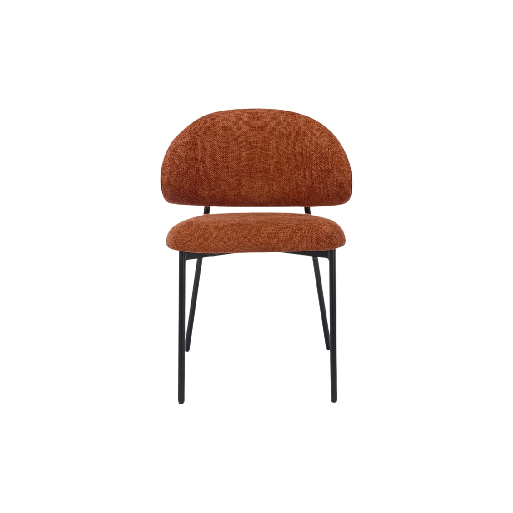 Chaise design moderne en tissu orange avec pieds en métal noir.