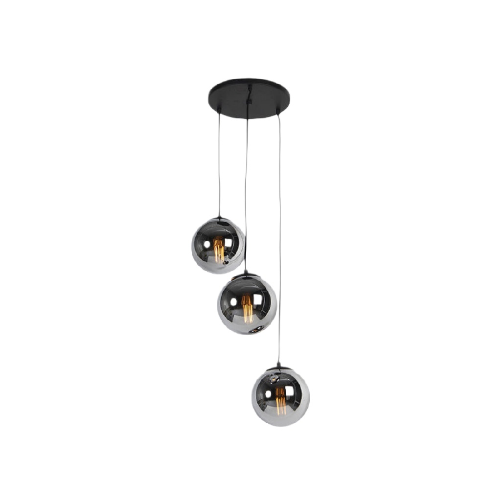 Suspension lumineuse en métal chromé avec trois globes en verre noir.
